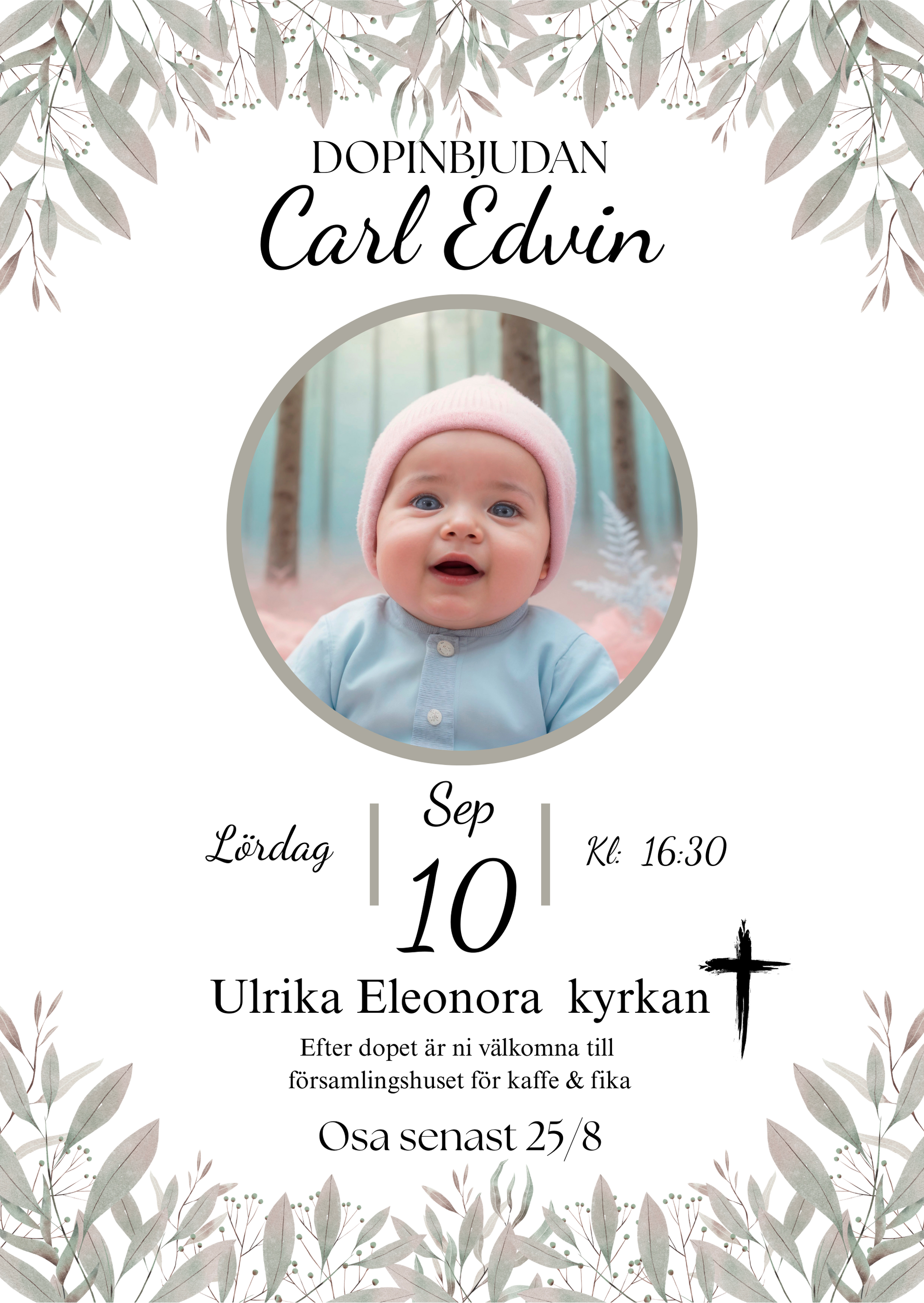 Skapa en minnesvärd dopinbjudan med din egen bild i den stilrena Lugo-designen. Perfekt för att bjuda in familj och vänner till ert barns dop med en personlig touch.